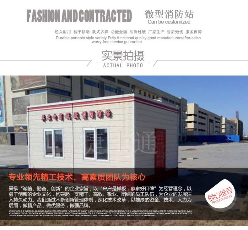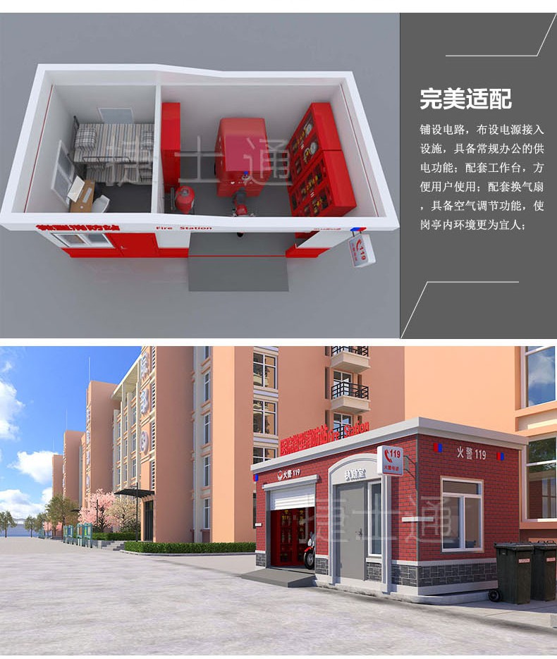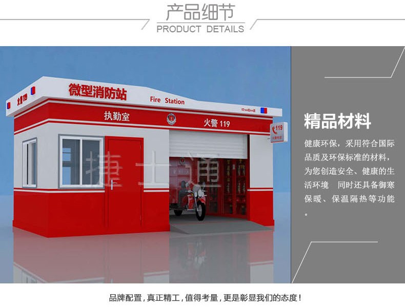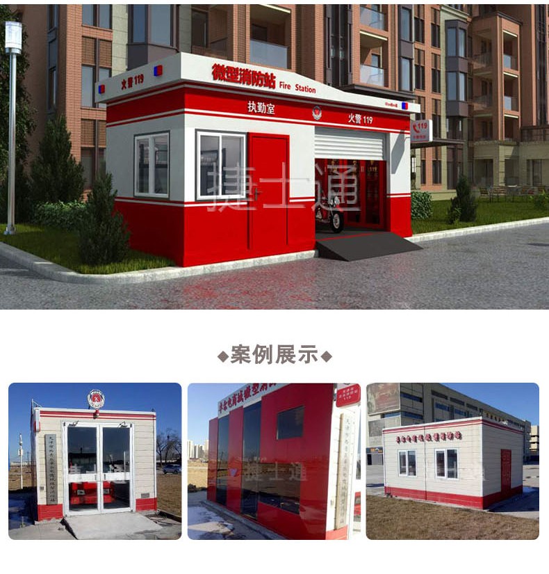 捷士通開設(shè)微型消防站產(chǎn)品線,產(chǎn)品采用輕鋼裝配,利于安放,功能具備值班室和車庫兩個(gè)功能。符合消防相關(guān)配置規(guī)定。