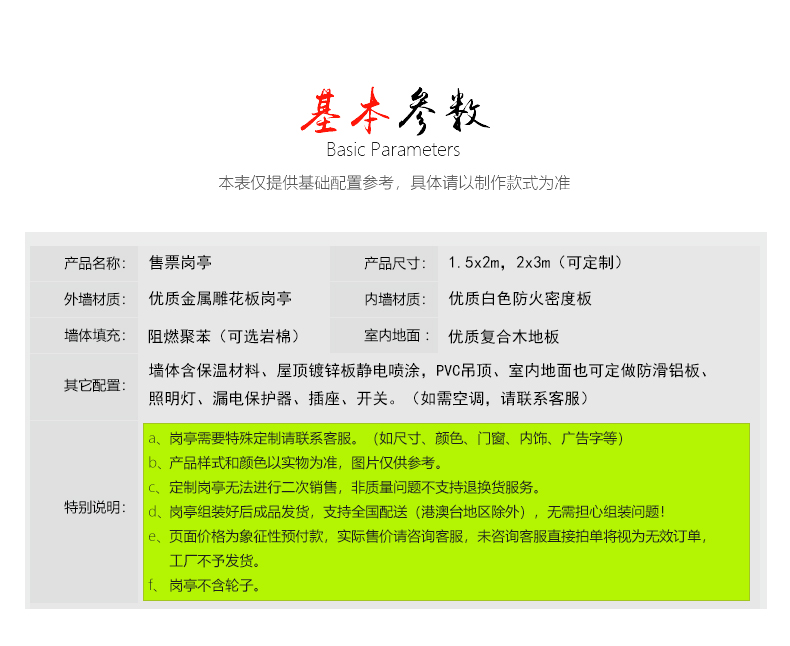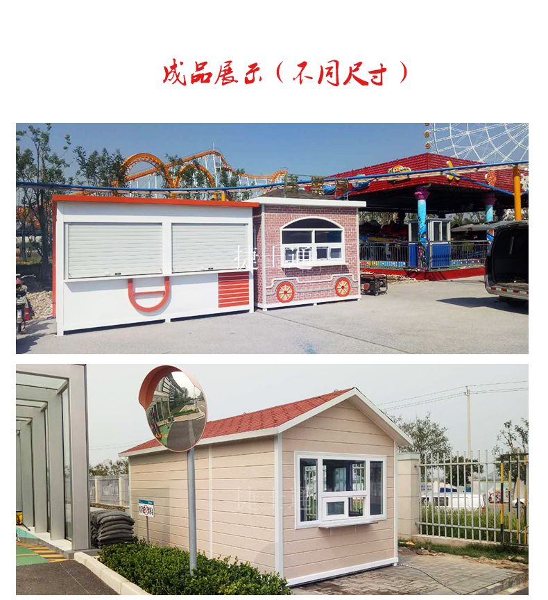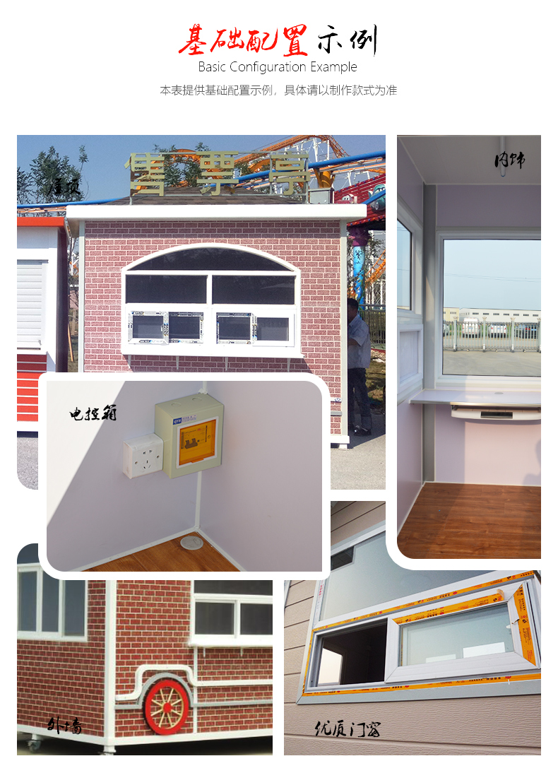 標(biāo)準(zhǔn)配置:墻體含保溫材料,屋頂鍍鋅板靜電噴涂,PVC吊頂,室內(nèi)地板可定做防滑鋁板,電箱、開(kāi)關(guān)、插座、暗敷電線、照明燈、桌面、抽屜、鍵盤(pán)托、空調(diào)架等。推拉窗多個(gè)窗口,方便與游客溝通。
