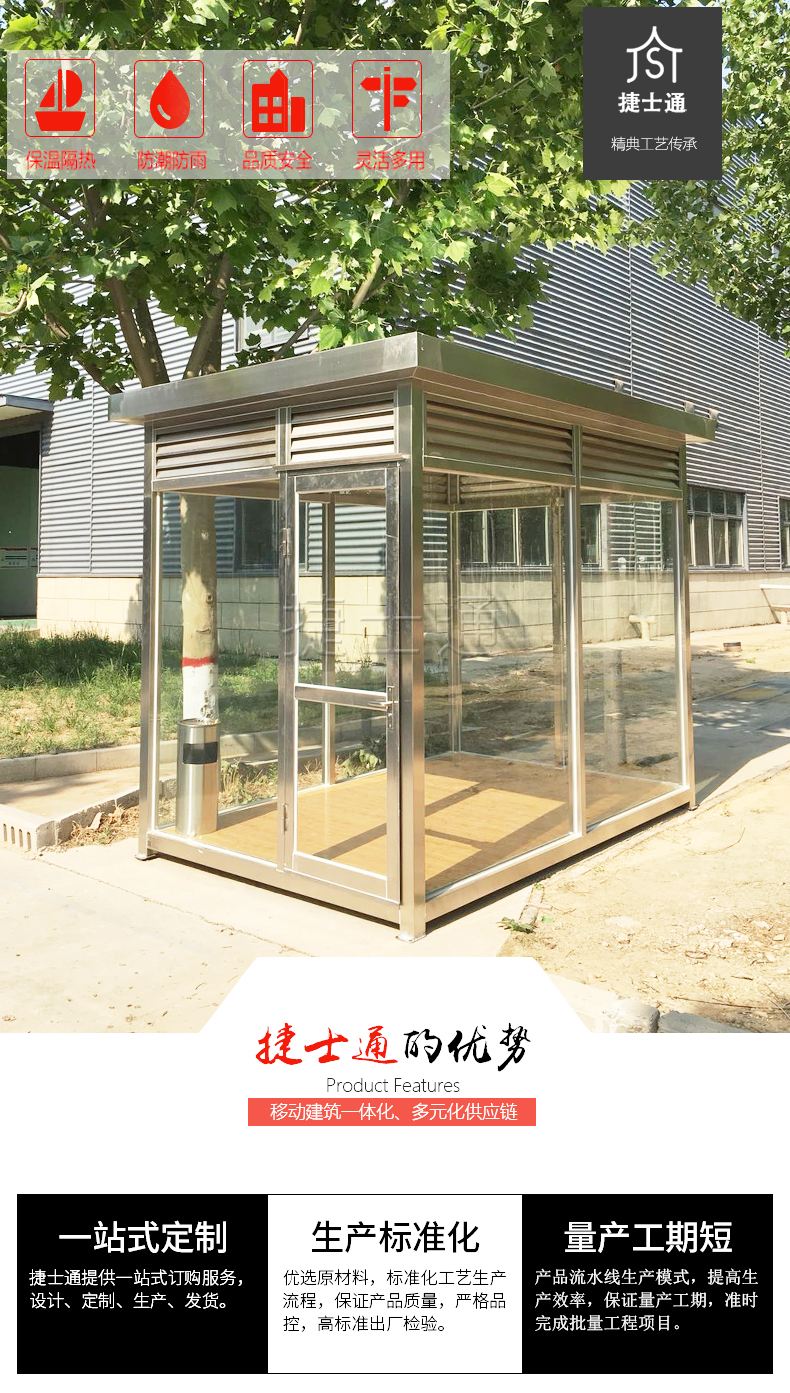 標(biāo)準(zhǔn)配置:屋頂鍍鋅板靜電噴涂,PVC吊頂,墻體玻璃材質(zhì)(鋼化、中空、有色玻璃等可定做),照明燈,漏電保護器,插座組,開關(guān),長凳,煙灰缸(如需空調(diào),排風(fēng)扇請聯(lián)系客服。咨詢電話:15822882616,公司網(wǎng)址:m.91porm.net