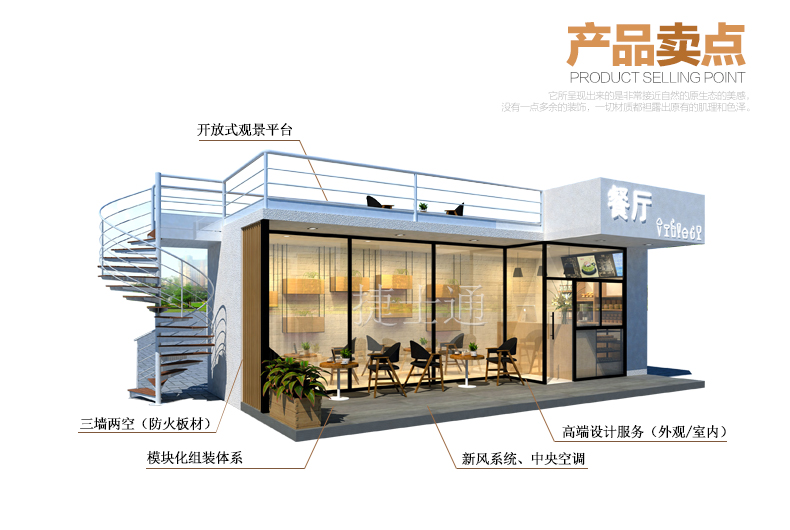 一個(gè)創(chuàng)新的商業(yè)空間載體,不僅僅是捷士通移動(dòng)房屋一直進(jìn)取的方向,同樣也是諸多商業(yè)管理公司一直尋找的全新商業(yè)經(jīng)營模式,美好移動(dòng)空間創(chuàng)辦人 --捷士通移動(dòng)房屋,積累多年行業(yè)經(jīng)驗(yàn),通過運(yùn)用裝配式房屋體系、鋼結(jié)構(gòu)為主體,搭配專利性墻體材料的形式,利用環(huán)保、便捷及美觀的設(shè)計(jì)理念,打造20-200平米輕奢移動(dòng)商業(yè)空間體—售貨屋及整條街售貨屋、售賣屋系列。