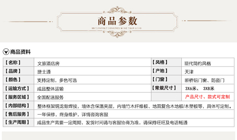 標(biāo)準(zhǔn)配置 :外墻:優(yōu)質(zhì)金屬雕花板/氟碳漆板/纖維水泥板可選。內(nèi)墻:復(fù)合木地板/竹木纖維板/木塑板......龍骨:優(yōu)質(zhì)鍍鋅方鋼龍骨焊接。室內(nèi)吊頂:優(yōu)質(zhì)PVC吊頂/納米纖維板可選。底座:鍍鋅方鋼焊接加黑竹木板模板。室內(nèi)地板:優(yōu)勢防滑鋁板/防滑瓷磚可選。門窗:斷橋鋁門窗、防盜門 。其他:照明、配電系統(tǒng)......可根據(jù)客戶需求進(jìn)行特殊定制。聯(lián)系電話:15822882616,公司網(wǎng)址:m.91porm.net。