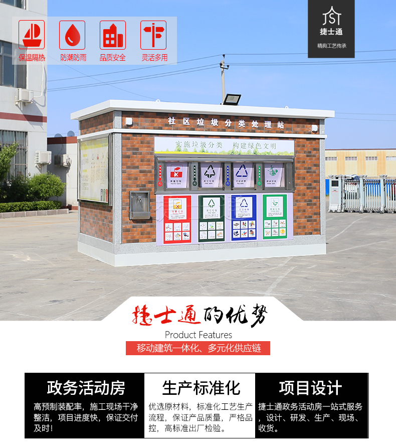 浙江垃圾房廠家定做杭州小區(qū)垃圾分類收集房 ,捷士通為2020年垃圾房解決方案的供應(yīng)商,因為針對沿海地區(qū),要解決潮濕,大雨等地理因素環(huán)境的影響,所以在垃圾房制作當(dāng)中,涉及到的特殊墻體,特殊的防腐蝕設(shè)計都是專門為江浙滬地區(qū)打造,有需要的江浙滬地區(qū)的客戶,可以隨時聯(lián)系我們!