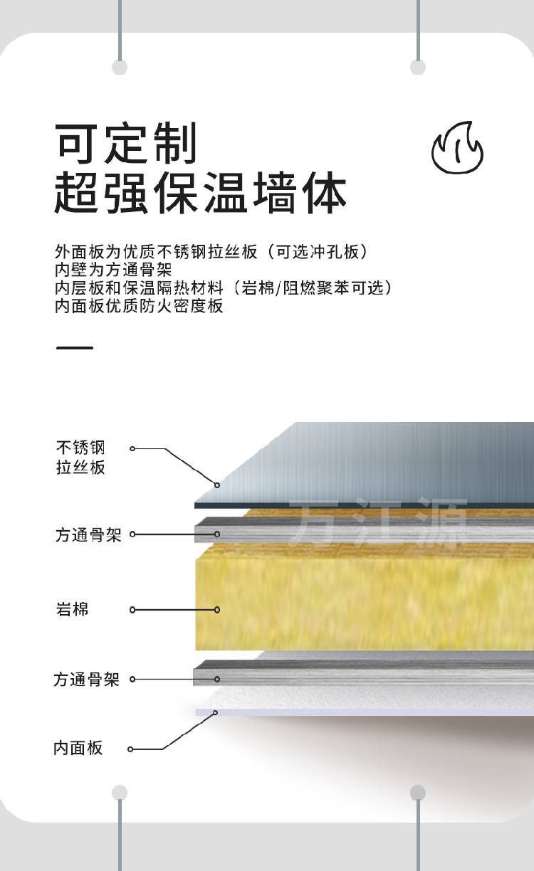 四、保溫好:這個方面是許多廠家不注重的,南方溫度較為適宜,因此不需要用到保溫,但是北方來說,保溫是必須要有的,北方冬天平均氣溫都在零度或者零下,因此保溫層和墻體厚度一般是80-100mm左右,保溫材料一般使用巖棉、擠塑板等。
